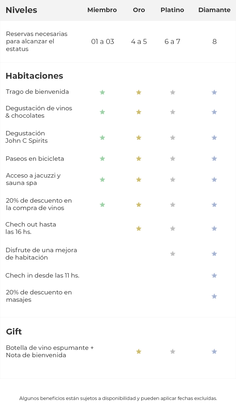 Los beneficios varían según el nivel alcanzado. Incluyen up grades, descuentos exclusivos, early check-in / late check-out y mucho más.